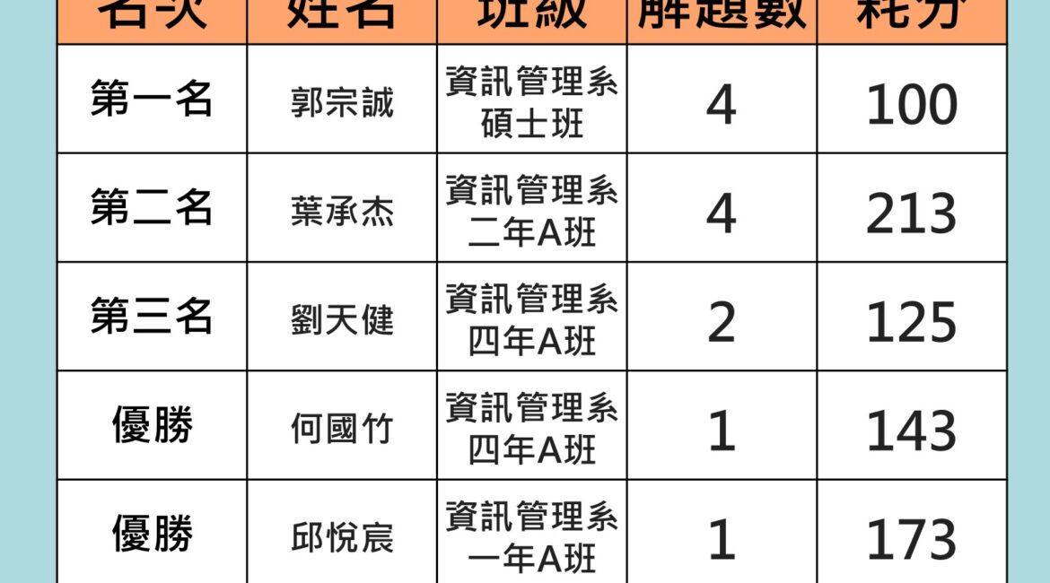 第三屆NPUST程式能力競賽 結果出爐! By assistIn 榮譽榜, 訊息公告Posted 2025 年 11 月 26 日 恭喜以下獲獎同學!! 我們將在114年12月15日(星期一)的7、8節於管院CM217教室舉行頒獎典...