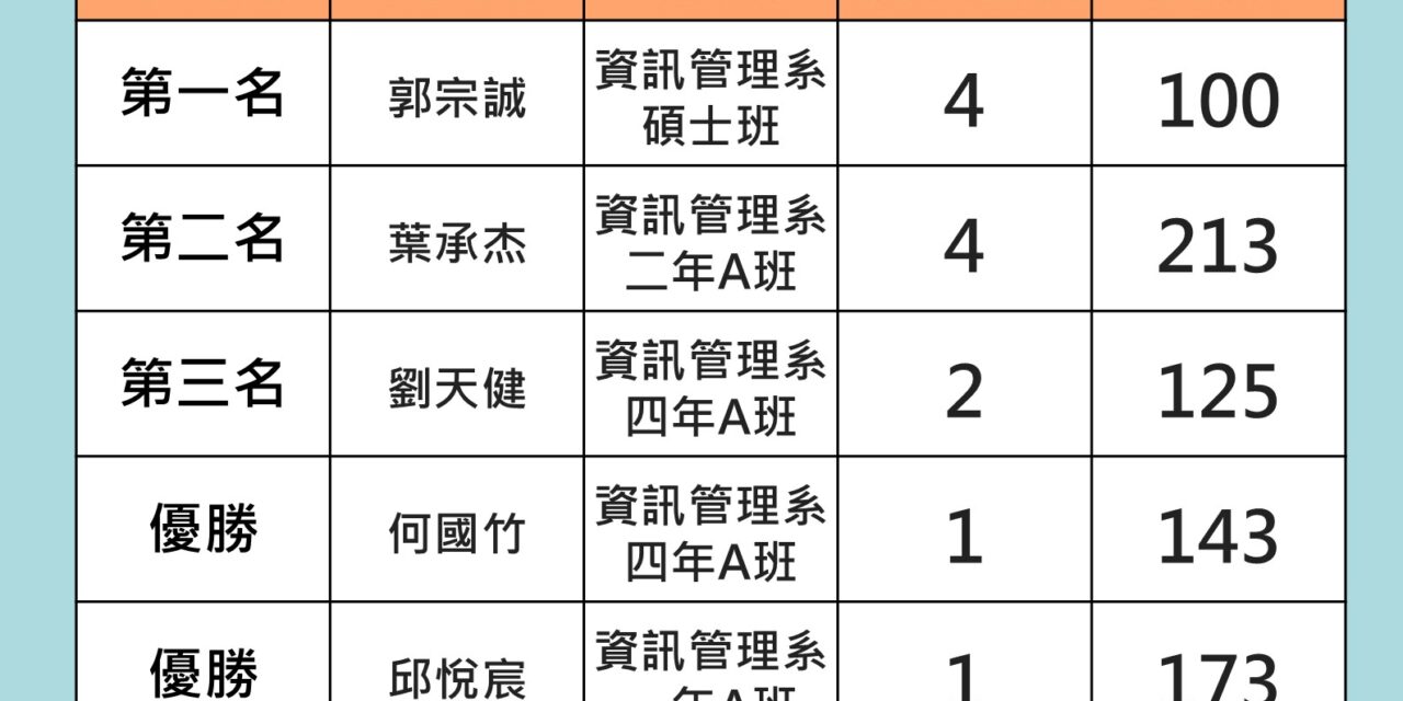 恭喜以下獲獎同學!! 我們將在114年12月15日(星期一)的7、8節於管院CM217教室舉行頒獎典禮。